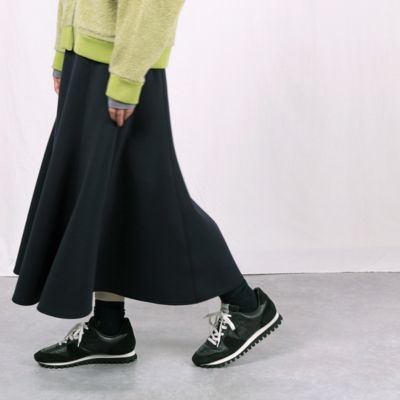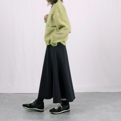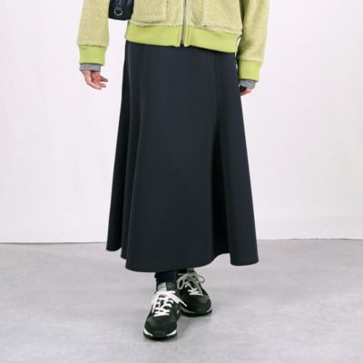 適度な肉感のダンボール素材を使用したフレアスカート。お腹まわりはすっきり見えを意識し、裾に向かってきれいに広がります。華やかなシーンにも、デイリーにスニーカー合わせもOK。今年は深みのあるグリーンとネイビーの新色を追加しました!(MD.S)