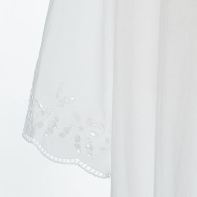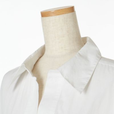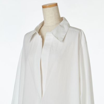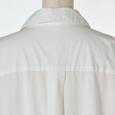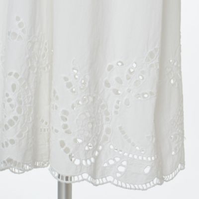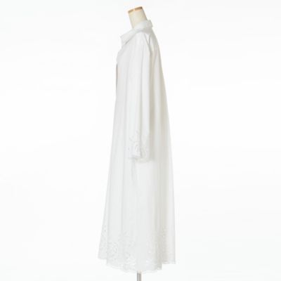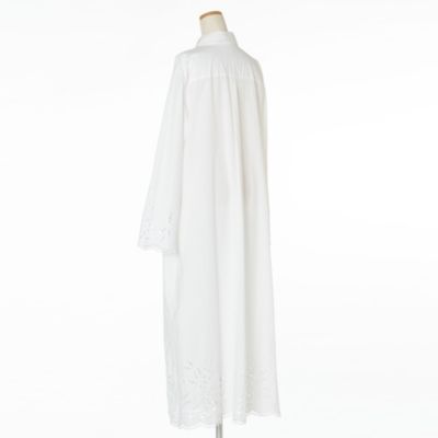 - パリッとしたシャツワンピースの袖口と裾の部分に華やかなカットワークレースがあしらわれて。身頃はゆったりとしていて、裾に向かって広がるリラクシーなシルエット。レースから肌がほんのり透けて見え、夏らしい涼しげな印象で装える一着。
