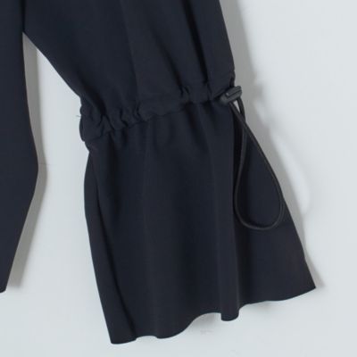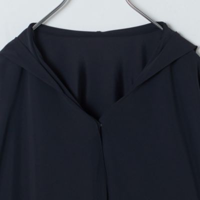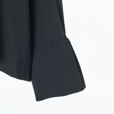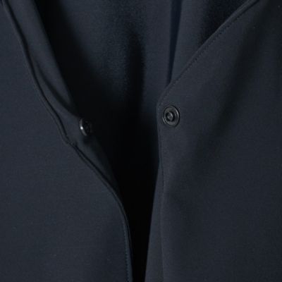 大人向けのスイムウエアを発信するスピードで選んだのは、大きなフードと大胆に前後差をつけたラウンドヘム、ベルスリーブでモダンに仕上げたアウター。リサイク ルナイロン糸を用いたサステナブル素材で、高いUVカ ット効果を搭載しています。水際シーンだけではなく、街での紫外線対策にもおすすめです。フーディアウターのフロントは、一番上だけをスナップボタンで留める仕様。ばさっとはおったときにできる裾のドレープ感が印象的。