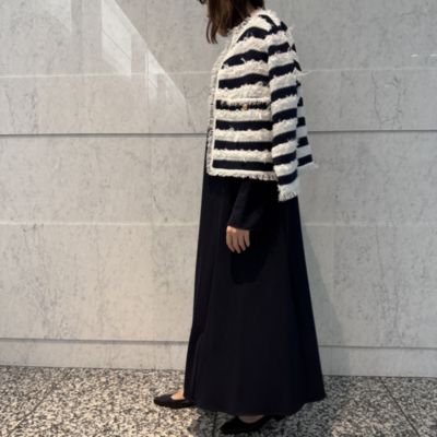 - 小物次第でデイリー、ドレスアップ、オケージョンと、あらゆるシーンに寄り添う懐の深さが魅力。すっきりしたショルダーラインが大人っぽく、縦の切り替えが華奢見えにもつながって。別注のネイビーは、青みが強すぎないシックな色みを追求。定番の黒も見逃せません。