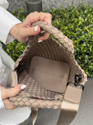 濡れや汚れもさっと拭き取れる、ネオプレイン素材で仕上げた2WAYバッグ。ハンドとショルダーで使え、ひとつひとつ丁寧に手織りされた、上品シックな雰囲気が魅力。小ぶりながらもたっぷりなマチ付き、付属のポーチも小物の整理に重宝します。