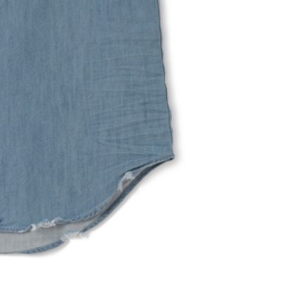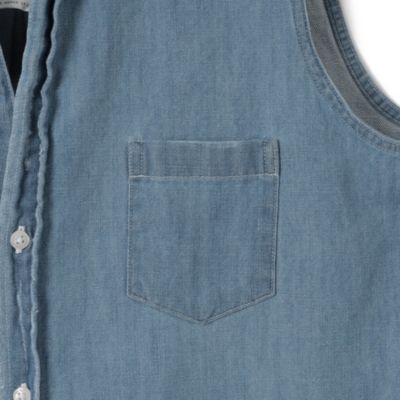 - フリルの立ち襟や裾のクラッシュ加工がポイントのスリーブレスシャツ。デニム見えするコットン生地が涼感を感じさせ、ヴィンテージな表情もありつつ、ひと味違うこなれた印象に。ベストのようにも羽織れ、ボデイラインをほっそり見せる効果も。