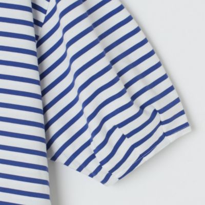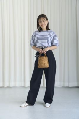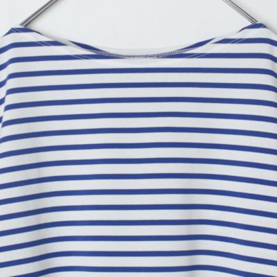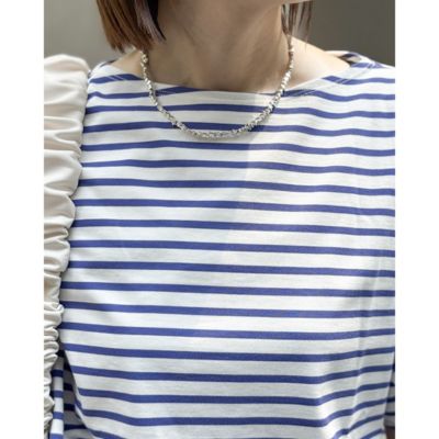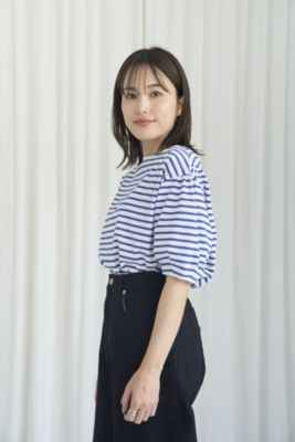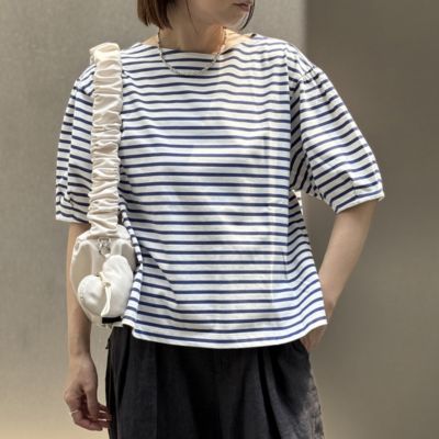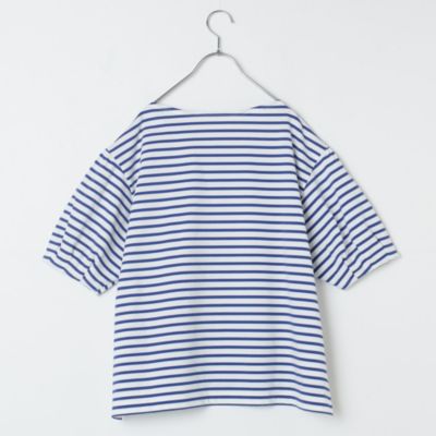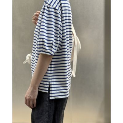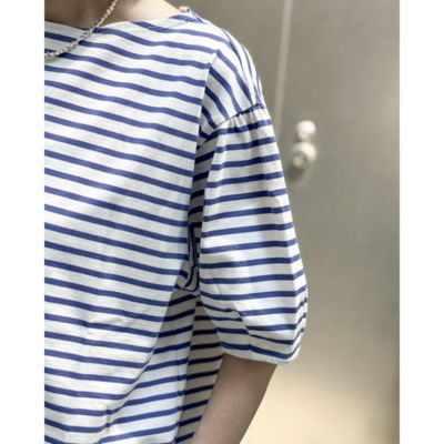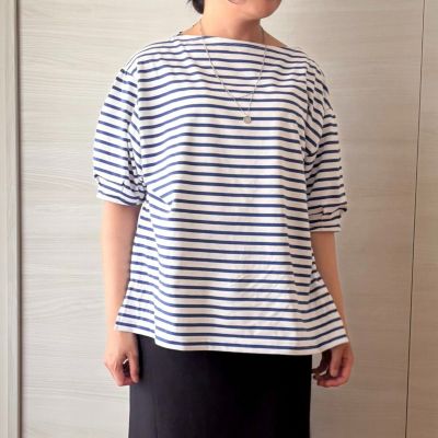 体のラインはカバーして、フェイスラインとひじ下をすっきりと見せるボートネック×ボリューム袖のプルオーバートップス。生地は度詰めで編み立てたハイゲージのコットン天竺で、しっかりとした素材感と優しくつやめく表面感が特徴です。サイドスリット入りの裾には前後差があり、アウトしたまま&前だけインも決まる設計。爽やかで好印象なホワイト&ブルーのボーダーと、無地好きな方のためにシックなチャコールの全2色で展開。