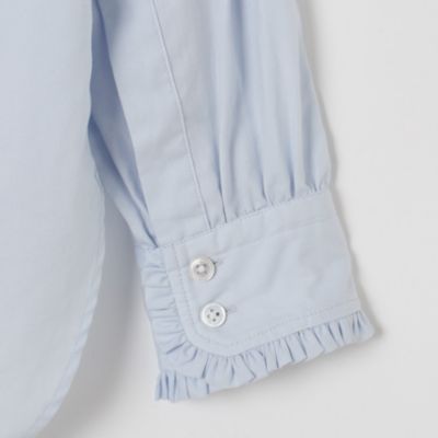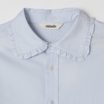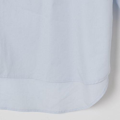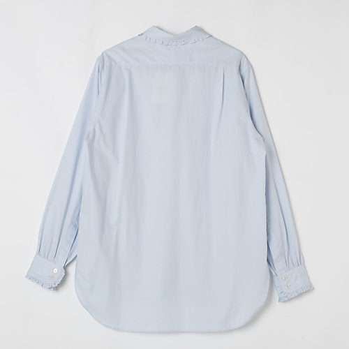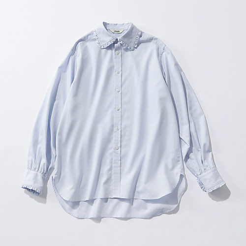 - ニットやスウェットの下にレイヤードしやすいように、オーバーすぎないサイズ感で仕立てたシャツ。襟と袖口のさりげないフリルがメンズライクなコーデを少し華やかに見せてくれる効果も。ブロード生地にシリコン加工が施されているので着やすく、ハリ感があるので一枚で着てもきれいなシルエットに。