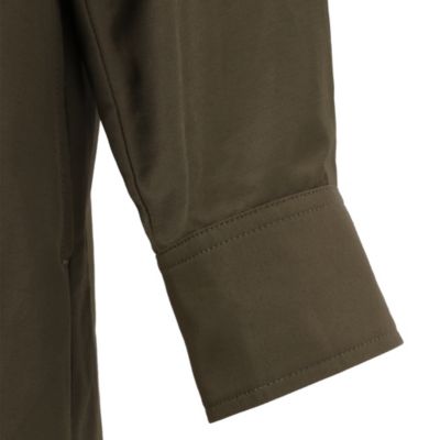 素材は撥水加工を施したコットンナイロンだから、急な雨でもへっちゃら。布目から風がスーッと通るので蒸れにくく、汗っかきでも快適に着られます。ほどよいハリと上品なツヤは、長時間の移動やデスクワークでもきれいをキープ。仕事終わりに会食へ、日中は旅の目的地まで移動し、夜はおしゃれなごはん屋さんへ――そんな昼夜でガラッと変わる日も、前を開けたり、袖をまくったりして自由に体温調節やアレンジができます。カラーは秋冬も軽やかなネイビーと、旬のブラウンともよく合うカーキの2色。着始めれば、その活躍ぶりに目をみはるはず。
