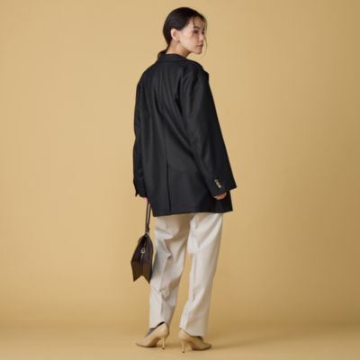 - 「BIG JK」 そのスペックはもはやコートのサイズ感で、着用スタイルのインパクトは絶大。他ブランドのオーバーサイズドJKとは異なり、スタイルが良く見えるところ、コーディネートのし易さ、着用感の良さがベネフィットポイントです。多くのオーバーサイズのJKは、肩パッドや裄綿、胸増芯などでJKの形を成形・保形する事が多いですが、小柄なかたや中肉中背の体型のかたには、借り着のように着られてる感がでてしまいがちです。 まるで肉襦袢を着ているかのような違和感があり、なかなかスタイリングがきまらないという難しさが存在します。クチュール・ド・アダムでは肩傾斜や袖山の高さ、前身頃と後身頃の分量の調整などによって、違和感無く着用できる