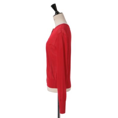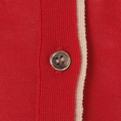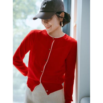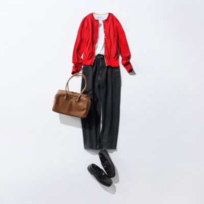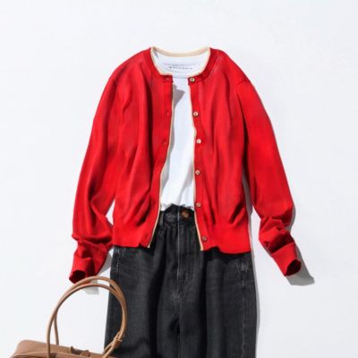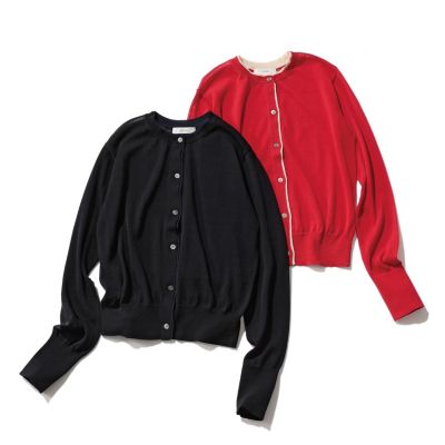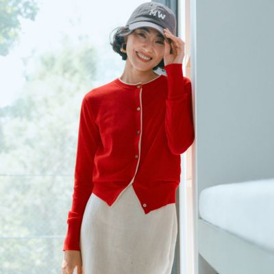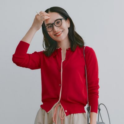- さらりとした清涼感のあるコットンナイロン素材で編み立てた、軽やかなシアーニットカーディガン。フロントの配色ラインがシンプルな中に洒落感を添えます。ブラックにはネイビー、レッドにはベージュ、オフホワイトにはベージュを効かせた配色で、奥行きあるスタイルに。すっきりシルエットで着膨れせず、パンツやスカート、ワンピースまで幅広く活躍。