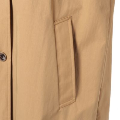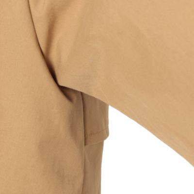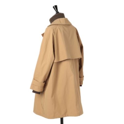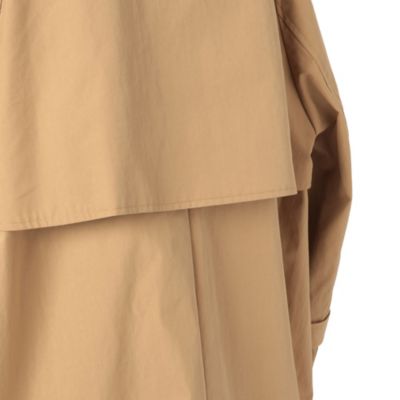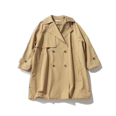 まずは、トレンチコートからご紹介。コットン70%、ナイロン30%という天然素材多めのほっとする着心地に、撥水加工をプラス。小雨に強く、汚れにくいから、明るいベージュでも天気を気にせず着られます。ほどよいハリもあるので、脱いで持ち歩いてもシワになりにくく、また羽織るときもパリッとスマート。シルエットは女性らしいAライン。テントのようにふんわり広がるオーバーサイズは、今っぽく見えるうえ、雨に降られてもボトムスが濡れにくいメリットもあります。