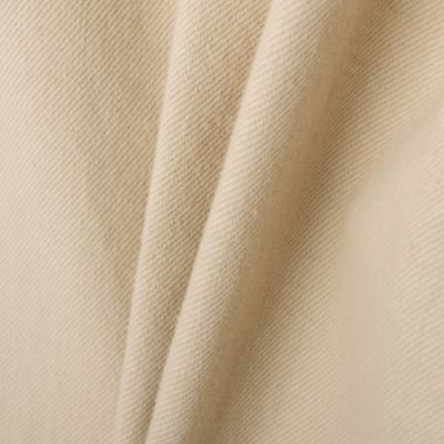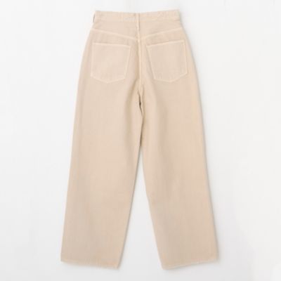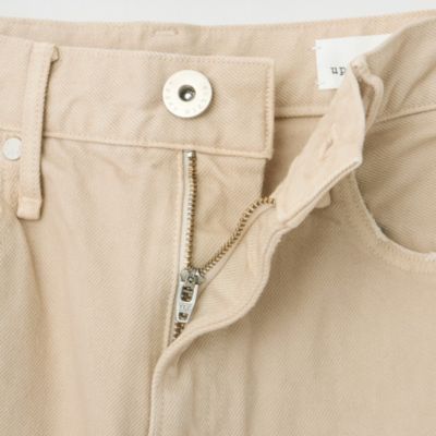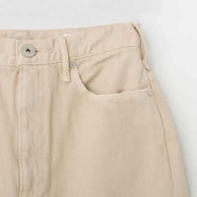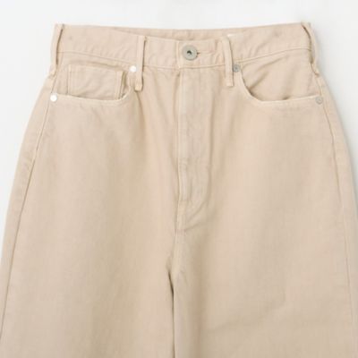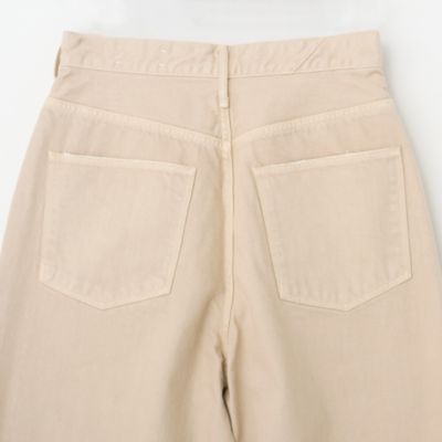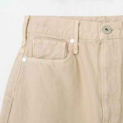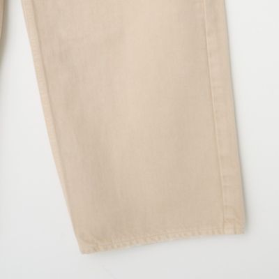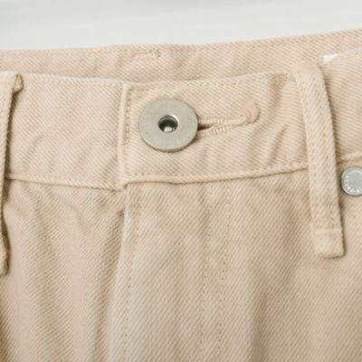 - デニムパンツは、お腹周りをしっかりと包み込むハイウエストでありながら、ヒップと渡り幅にゆとりを出したルーズシルエット。オーソドックスなインディゴブルーとともに展開する、白のようなベージュのような、ニュアンスある発色の”カシュー“は、樋口さんイチオシのカラー。