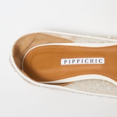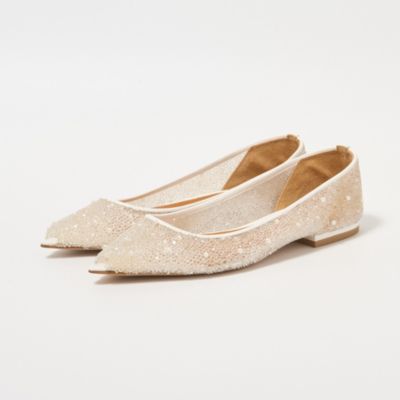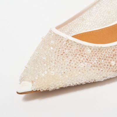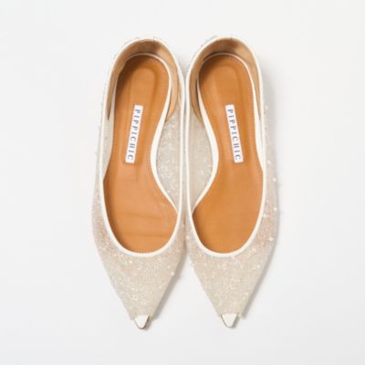 - PVC素材の上にちりばめられた白パールと繊細ビジューが美しく可憐な一足。ポインテッドオープントゥと浅めの履き口で足元を華奢に見せつつ、1cmヒールでさりげなくスタイルアップも叶えます
