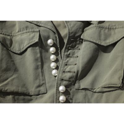 ミリタリーライクなジャケットに、華のあるパールボタンがあしらわれた一着。着るだけでスタイリングの主役になります。