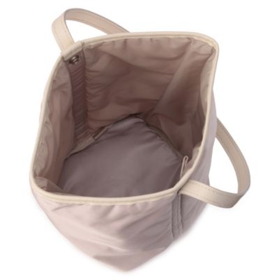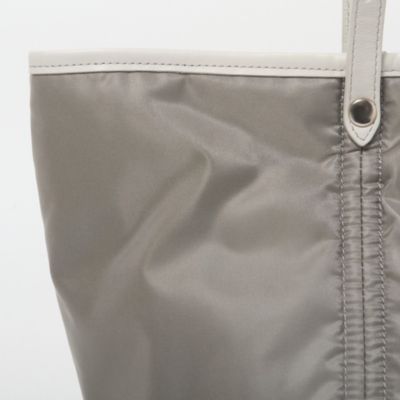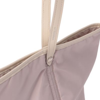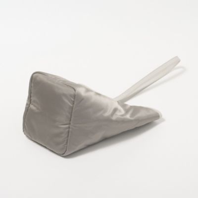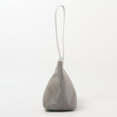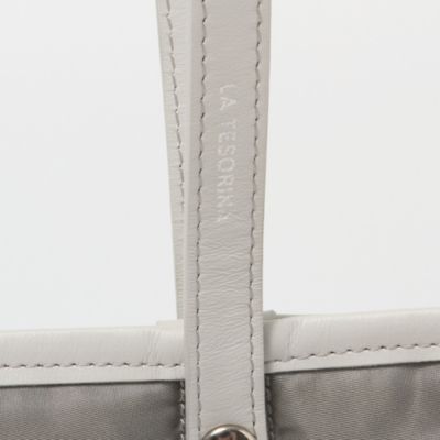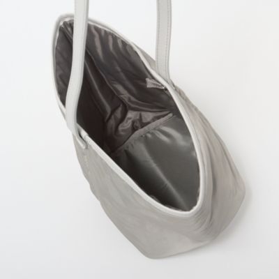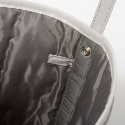 ブランドのアイコンモデルでもある中綿入りのトートバッグにペールトーンのグレーカラーを別注。ツヤのあるナイロンに、微配色にしたイタリアンレザーのパイピングがアクセントになっています。女性デザイナーならではの気の利いたデザインで、片手でラフに持った時にも地面につかない絶妙なショルダーストラップの長さもポイントに。