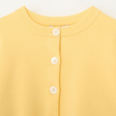 ふっくらとしたニットの立体的なフォルムが際立つクルーネックカーディガン。表はコットン、裏はポリエステルで編みたてているので、コットンのソフトな風合いと、ポリエステルのしゃきっと感が両立したアイテムです。長く着てもへたれにくいのもうれしい。シックに合わせられるネイビーと、顔回りを明るく見せるクリームイエローをハピプラだけで別注。