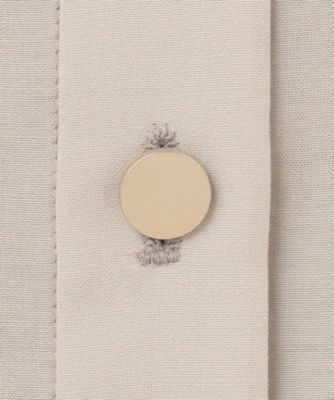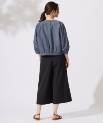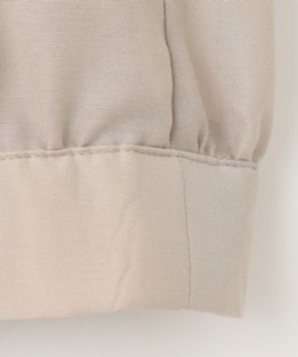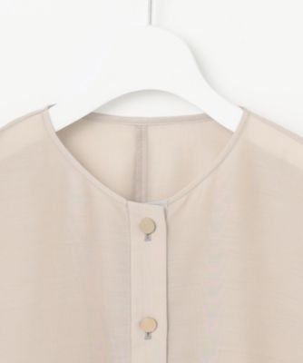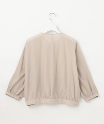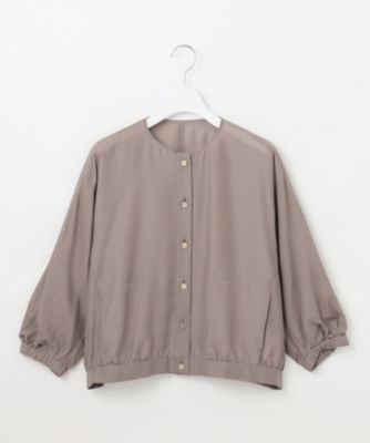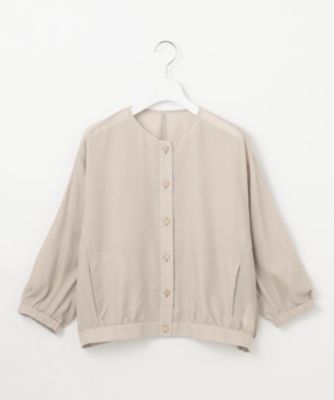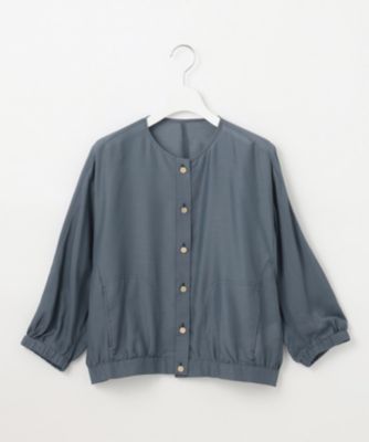 ブラウス感覚で羽織れるシンプルなノーカラーブルゾンです。前はドロップショルダーですっきりと、後ろはドルマンスリーブで程よくゆとりを持たせ、抜け感を感じられるデザインに仕上げました。シンプルでありながら、こだわりのフォルムとトレンドのシアー素材、小さなメタル釦がきらりとアクセントになったリッチ感のあるデザインがポイントです。短めの着丈なのでワンピースやワイドパンツと好相性です。袖口はゴム入りなので、袖をたくし上げて着て頂くことも可能です。■素材