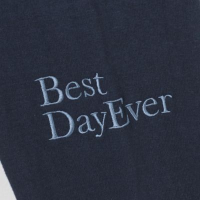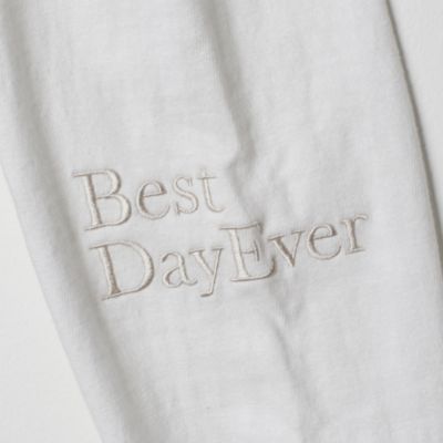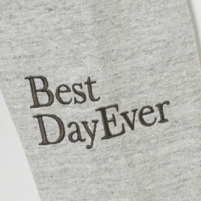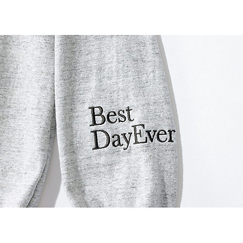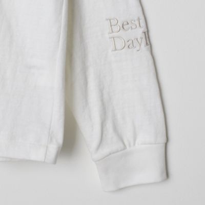 左袖に「人生最高の日!」の意味合いの英文と、首の後ろにブランド名の刺しゅう入り。ボディと同系色。