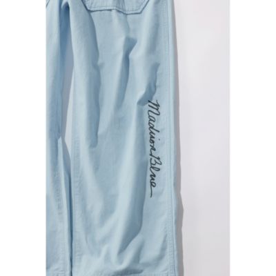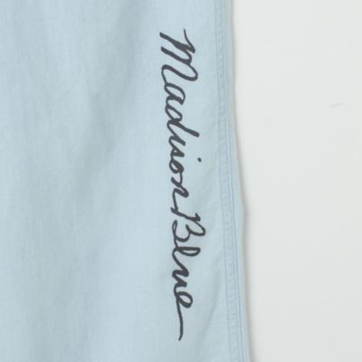- MADISONBLUEのアーカイブモデルであるジャンプスーツをベースに、25SS新しく登場した薄手のシャンブレーデニム素材を落とし込んでもらった別注。シャツ素材なので、1枚着はもちろん、袖を腰に巻いたスタイルも決まります。ひだりあしの部分には、落書き風の『MADISONBLUE』プリントを配した、ハピプラだけのスペシャルモデル。デザイナー中山氏の遊び心が光るデザインに仕上げていただいています!(バイヤーnana)