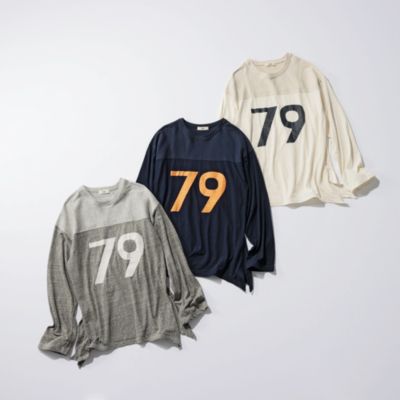 通常廃棄される綿(落ち綿)をリサイクル資源として利用した、自然なムラ感のある風合い豊かな素材を利用したフットボールTシャツ。フロントには79のナンバリングプリント。