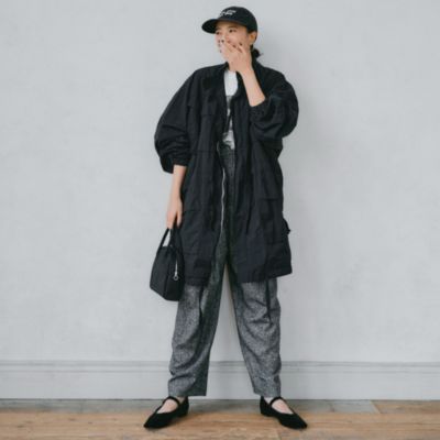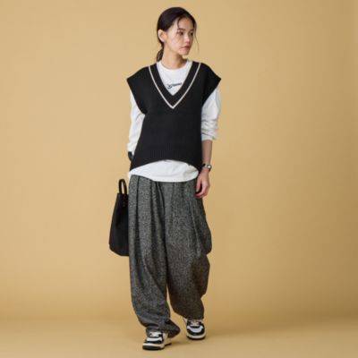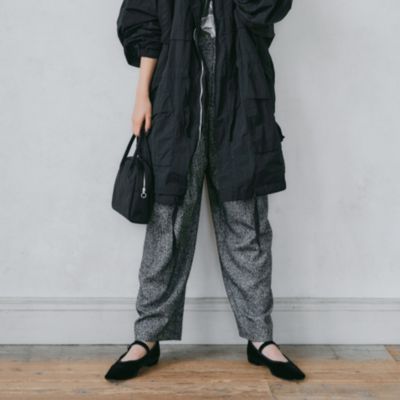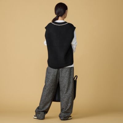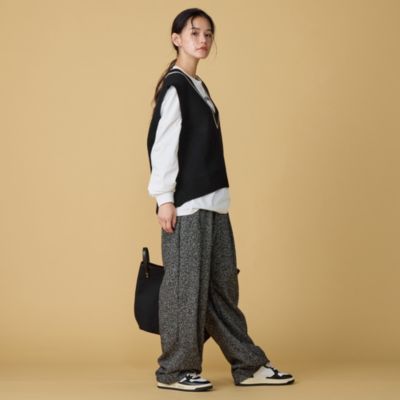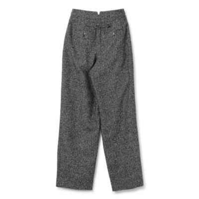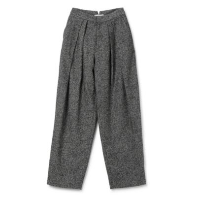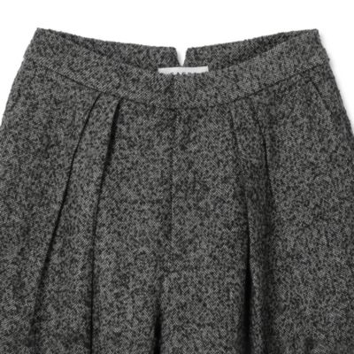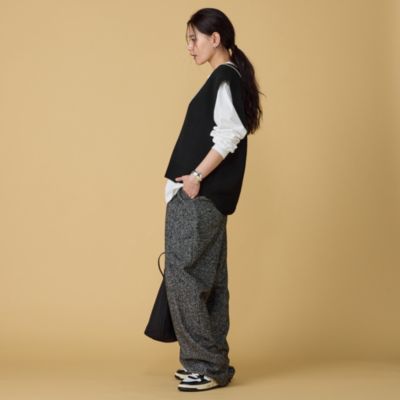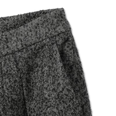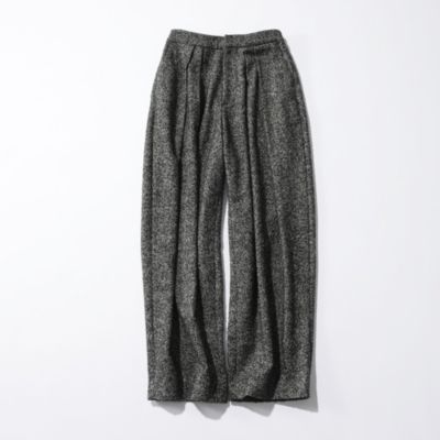 - 上質なヘリボーンツイードで仕立てた美しいワイドパンツ。腰回りはゆったり、裾にかけてテーパードさせたラインが美しく、はくだけでモードな雰囲気に。背中側のウエスト部分はシンチバック付きで、後ろ姿もかっこいい。裏地付きでチクチクせず真冬も暖かくはけます。