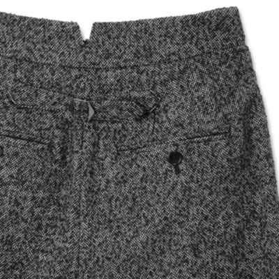 SACRA別注素材のイタリア老舗BALI社の上質なヘリンボーンツイードを使用したテーパードパンツ。深みのある表情と上品な光沢が魅力。バックスタイルの尾錠付きベルテットディテールもポイント。上質な素材感がクラス感を高める大人の一着。