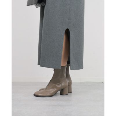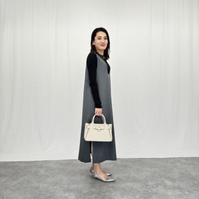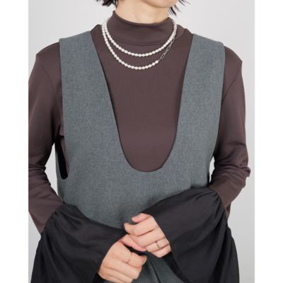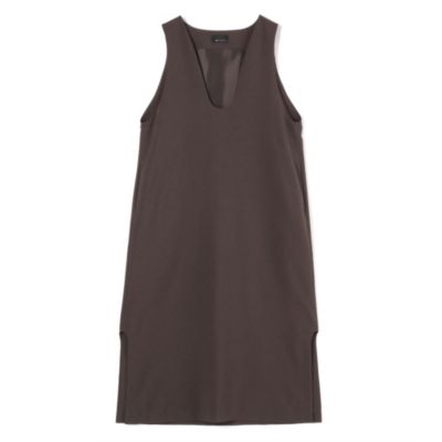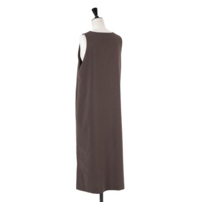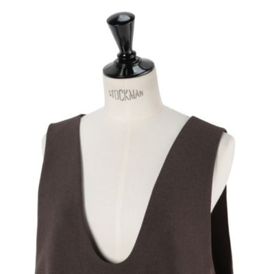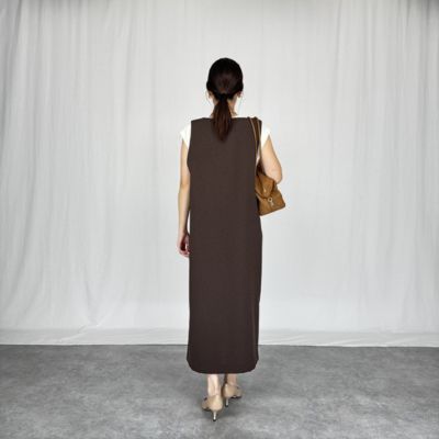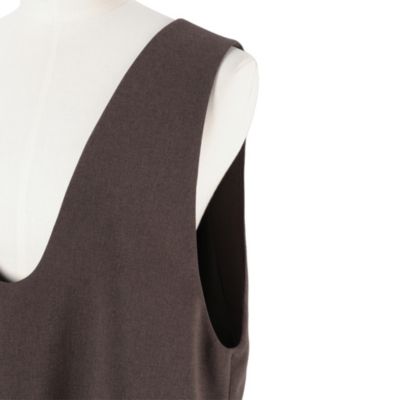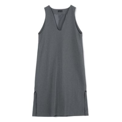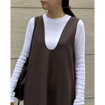 ミニマルな印象のUネックがポイントのジャンパースカート。すっきり着られるIラインシルエットストンで身体のラインを拾いにくく体型も程よくカバーできます。Uネックとデザインがリンクした深めの両サイドスリットで足さばきも良く、ブーツとのコーディネートにも使いやすいです。メランジの色調がウールライクな見た目ですがさらっとソリッドな素材なので、長い期間着用出来ます。