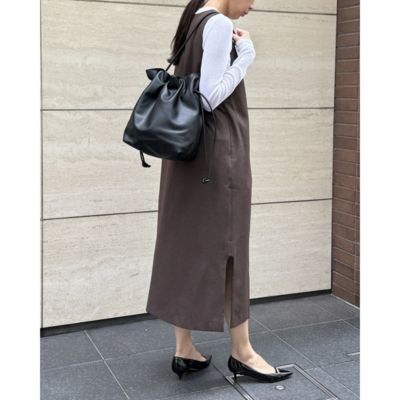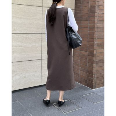 身長152cmで着ると、ちょうどくるぶしの少し上くらいまでの長め丈。低身長だとジャンパースカートは子供っぽく見えやすいのですが、この丈感なら大人っぽい雰囲気に。深めのUネックもめずらしく、すっきり見えるところが気に入っています。シワになりにくいハリのある素材なので、カジュアルすぎず“きちんと感”も。残暑の時期はTシャツ、秋口はニットを合わせて長く楽しめそうです。