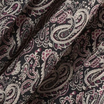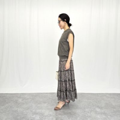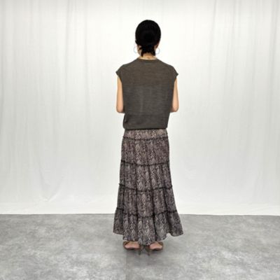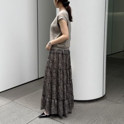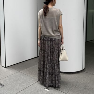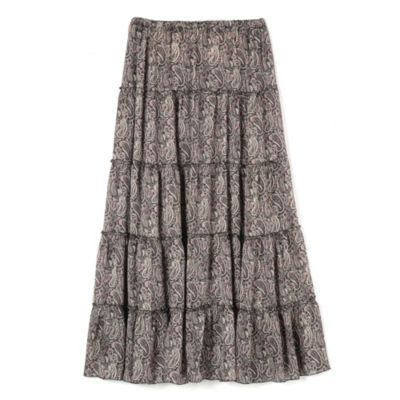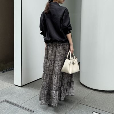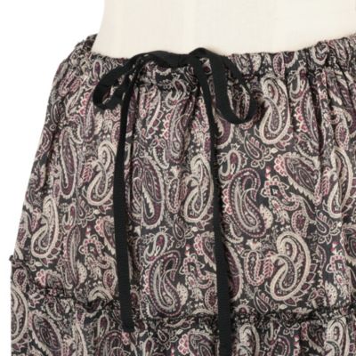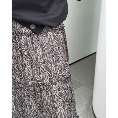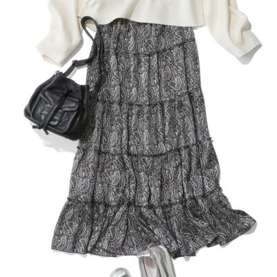 - モノトーンをベースにしたペイズリー柄とリッチな5 段ティアードが印象的。軽やかな素材で落ち感があり、動きに合わせてふんわり揺れて女性らしいシルエットに。ウエストはドロスト仕様で調整ができるのもうれしい。
