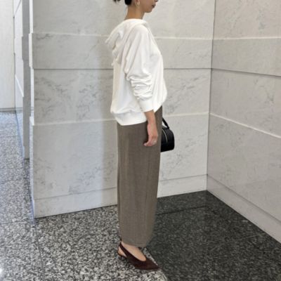 - 適度にハリのある素材感で、すっきり見えるタイトラインでありつつ立体感が出るので体のラインを拾いにくい。スニーカーともパンプスとも相性抜群。ウエストが“見えてもきれいな”総ゴム仕様なのもうれしい。