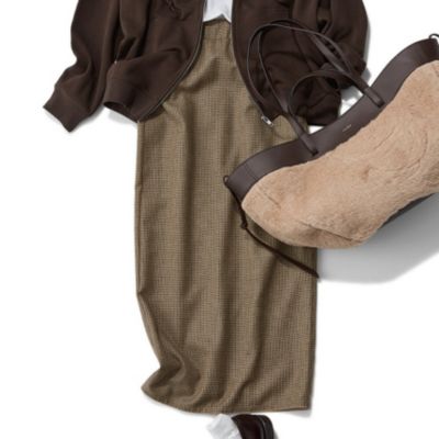 今シーズン多く見かけるチェック柄ですが、アイテムによってはほっこりしすぎたり子供っぽくなってしまうことも。その点これは、長さがしっかりあるI ラインスカートだから確実にキレイめに仕上がるのが魅力。だからこそ、思い切ったカジュアルダウンも楽しめます。」