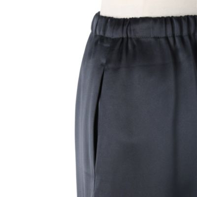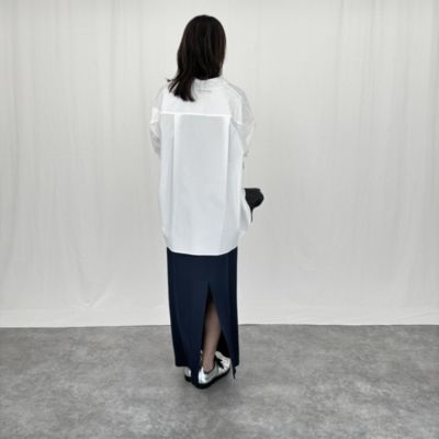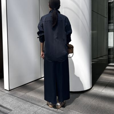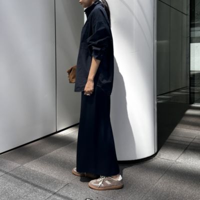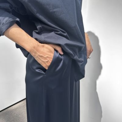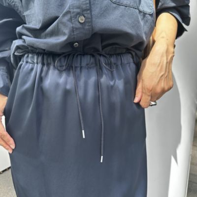 程よいハリ感と肉感をもった素材は、上品な光沢とキレイな落ち感が特徴です。ストレートシルエットのスカートは、極力ハギ目を減らし、生地感を生かしたキレイなラインをつくっております。華奢に仕上げたゴム仕様のウエストもドローストリングを入れる事で履き位置を調整して着用頂けます。
