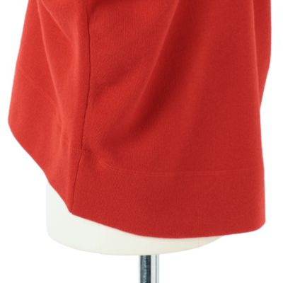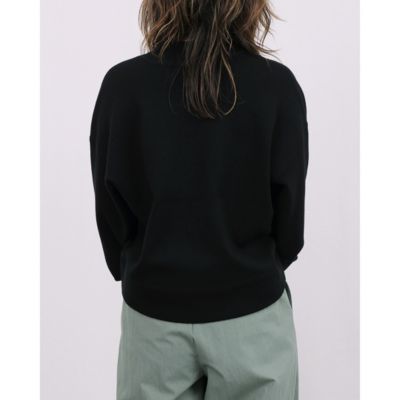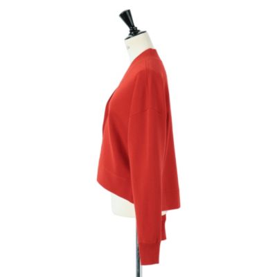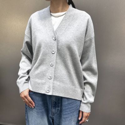 前身頃は胸元を気にせず一枚でも着られるVネックの前明きで、首周りがすっきり見える前下がりに調整しました。程よい厚みで秋から春先まで対応できるのも魅力です。何枚持っていても便利なVカーディガンはボトムスに合わせて2サイズを着こなすのもおすすめ。
