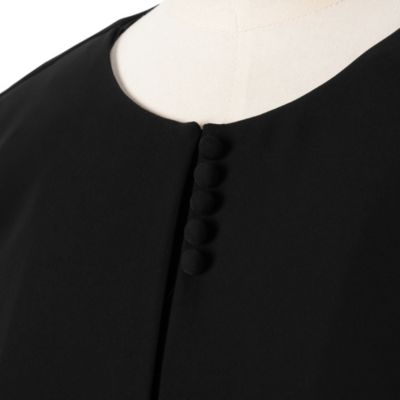 華美になりすぎないくるみボタンを使用し、落ち着いた印象。フロントファスナー仕様のため、着脱がスムーズ。授乳中の方にも便利な一着です。洗濯機洗い可能の生地を使用しているので、普段の取り扱い方法も簡単です。生地には、礼服用の深みのある黒を使用。上質な発色で、フォーマルシーンにふさわしい落ち着いた印象を与えます。結婚式や卒業式などのお祝いの席から、お葬式などのお悔やみの場まで、冠婚葬祭全般で着用できるフォーマルウェアです。また、シンプルで洗練されたデザインのため、普段使いやビジネスシーンにも活躍します。