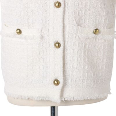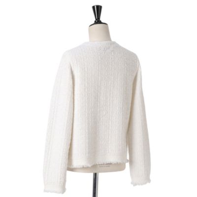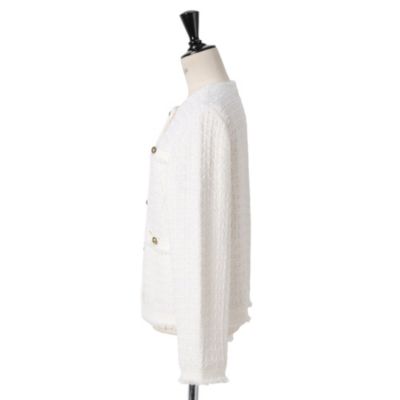 - 袖口、すそ、ポケットのフリンジとメタルボタンが華やかさを演出。きちんと感がありつつかっちりしすぎず、仕事やハレの日はもちろん、デニムやカーゴパンツを合わせてデイリーカジュアルにもアレンジ可能。ツイードジャケットのようなデザインで複数の糸を織り交ぜてニットで編み立てたかっちりとしすぎないニットツイードジャケットです。
