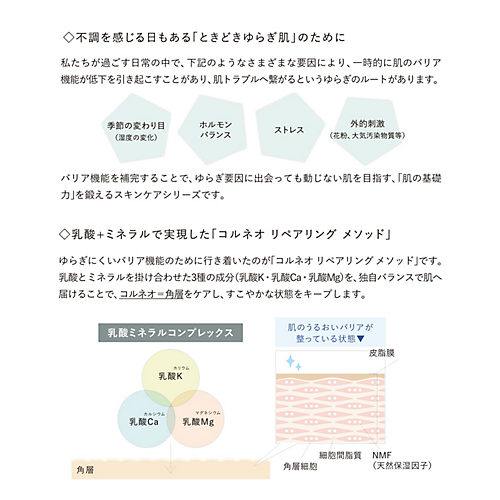 | 全成分表示 | 水、グリセリン、ココイルグリシンNa、マルチトール、ラウロアンホ酢酸Na、クエン酸、ポリクオタニウム-7、乳酸K、乳酸Ca、乳酸Mg、プロパンジオール、ペンチレングリコール、ヒドロキシプロピルメチルセルロース、ジメチロールプロピオン酸ヘキシル |