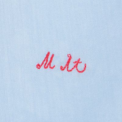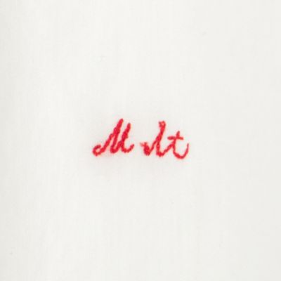 握手やハグをしたときに自然と相手の視界に入るよう、袖口と肩に刺しゅうでモチーフが配されている。SPURSHOPの別注では、四つ葉のクローバーに。シャツをまとう人も、挨拶する人も幸せな気分になってほしいという願いからだ。前身頃にはアクセントとして、赤い糸でブランド名より「Mit」を飾った。すべての刺しゅうはインドの職人が一つずつ丁寧に手がけている。今日出会う人のことを思い浮かべながら袖を通せば、服を着る喜びがいっそう膨れ上がる。