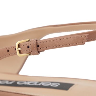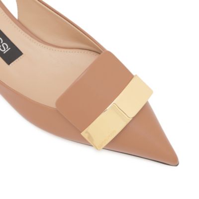 フラットのスリングバックは歩きやすさを叶えつつ、ポインテッドトゥのシルエットでタイムレスなエレガンスも表現。ブラックにはシルバープレート、マカダミアブラウンはゴールドプレートで仕上げています。
