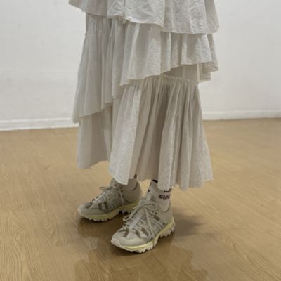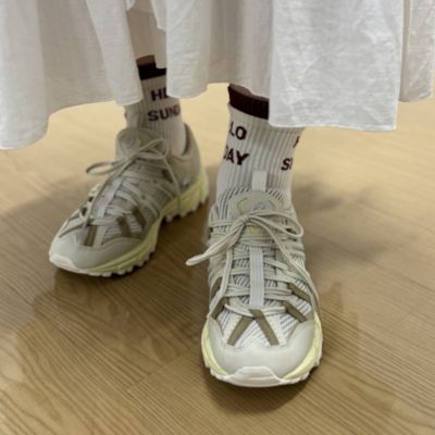 優しげなカラーリングに、さりげなく効かせた細いシルバーラインがほどよいアクセントです。クッション性に優れた快適な履き心地で、デイリーからハイキングまで幅広く活躍すること確実。ワンピやスカートはもちろん、白パンツでのワントーンコーデもおすすめ。