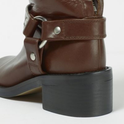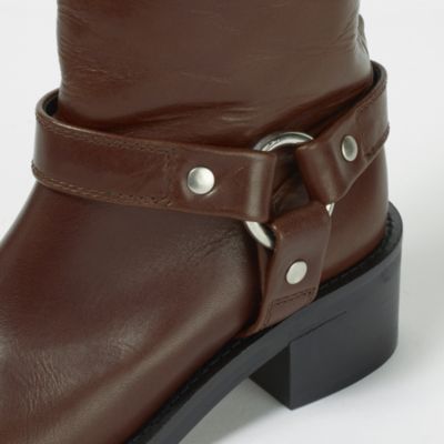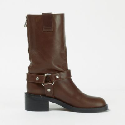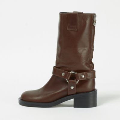 赤味のあるブラウンカラーで無骨なエンジニアブーツが女っぽく。控えめなツヤ感と低めヒールが使いやすく、コーデのテイストを選びません。バックジップ付きで着脱のしやすさも◎。