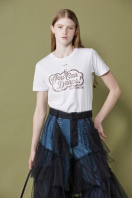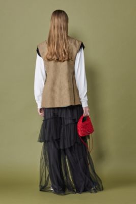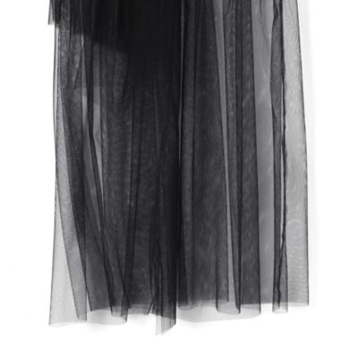 ランダムチュールが変化感のある奥行きを与えてくれるシアーパンツ。裾広がりのワイドシルエットなので手持ちのパンツにさっと重ねたり、素足を覗かせる攻めのスタイルも今季ムード。贅沢な生地ボリュームと、全方向着映える立体的なシアーデザインはパーティーシーンにも活躍必至!