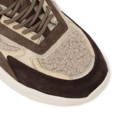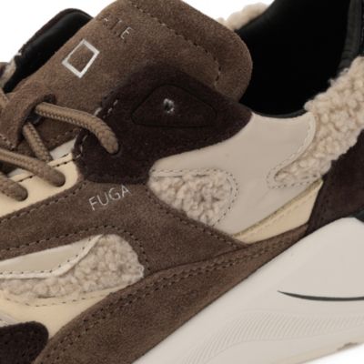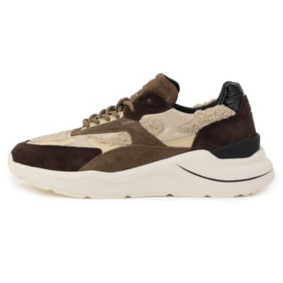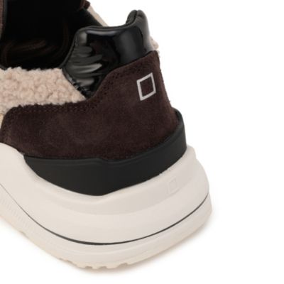 深めのブラウンと細かく配置されたファー素材のベージュのカラーリングが大人な女性の足元をよりエレガントに演出する。