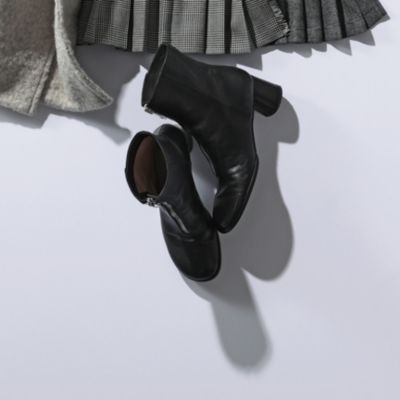 存在感あるフロントジップは、足元をシャープに見せると同時に、縦ラインを引き立てる効果も。すっきりとしたラウンドトゥとチャンキーヒールのボリューム感の対比も洒落ています。フェミニンコーデにも馴染む辛口具合も、日常使いにピッタリ。