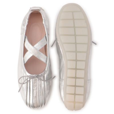 スポーティーな要素を投入した、ナッパレザーのバレリーナパンプス。伸縮性のあるクロスストラップが甲をしっかりサポートし、しなやかな履き心地の羊革もポイント。しっかりとした深ミゾのグリップソールで、悪天候でも滑りにくく安心です。