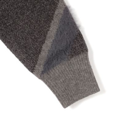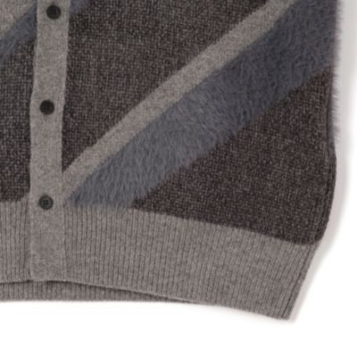 グレーベースでまとめたレジメンタルストライプのカーディガン。シックなカラーリングながら大胆な斜め模様でインパクトは抜群。ゆとりのあるサイズのカーディガンはコーディネートの幅も広い。(エディターoku)