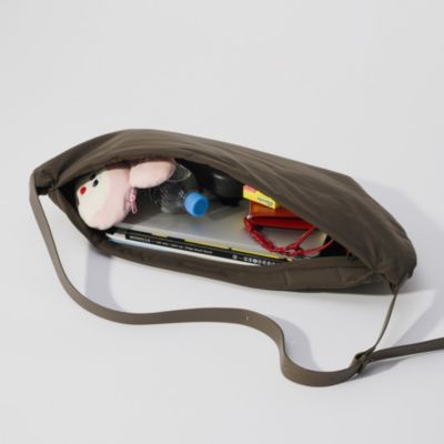 お出掛けの荷物がしっかり入る、ラージサイズのパデッドバッグ。内部には小物の収納に便利なファスナーポケットがあり、ショッピングからレジャーまでの幅広いシーンに投入できます。軽やかタフタ素材×半月型で、ボディバッグ風にも使えるアイテムです。