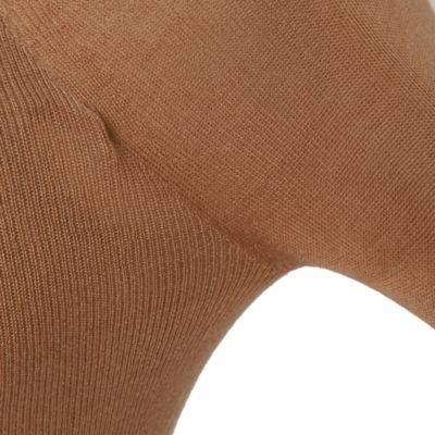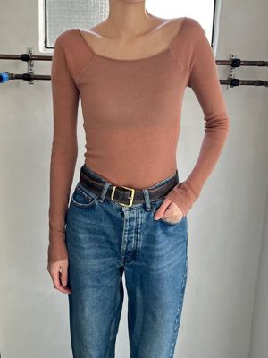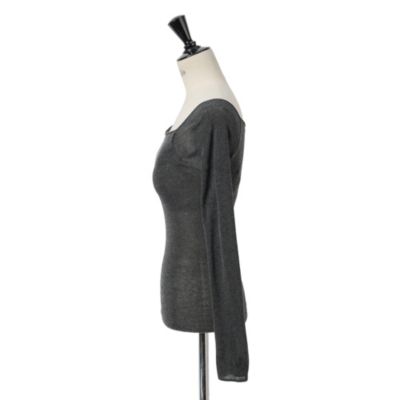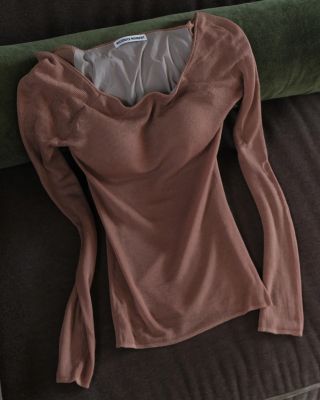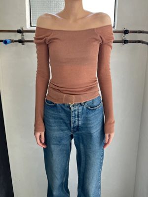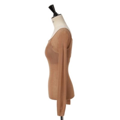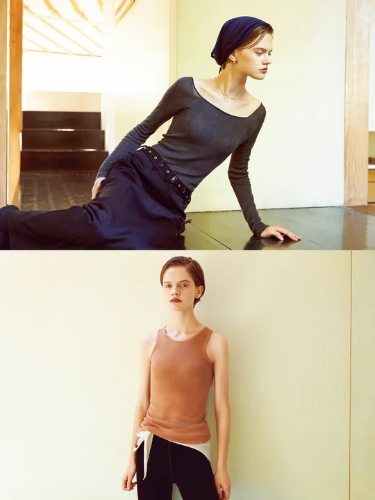 ファッションラバー御用達のアンダーウェアブランドとして名高いナイスナイスモーメント。カシミヤ混の再生繊維を用いた新型のトップスは、カップつきで下着いらず。ストレッチ性が高く肌あたりのよい素材をホールガーメントで編み立て、よりフィット感のある快適な着心地に。ピーナツ型のカップはバストを面でしっかり支え、シルエットを美しく整えてくれる。オリジナルのクロップド丈に対し、SPURSHOPでは大人も手に取りやすいよう、おなかが隠れる丈感に変更。別注色として、シックなチャコールグレーとコーラルベージュを選んだ。ロングスリーブタイプは、オフショルダーで着用することもできる。インナーにもなる汎用性の高さで、年中活躍すること間違いなし。
