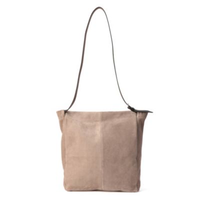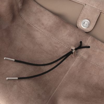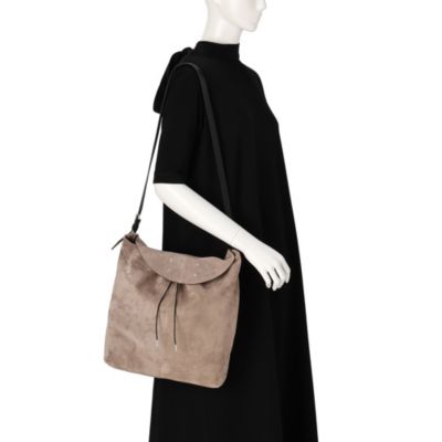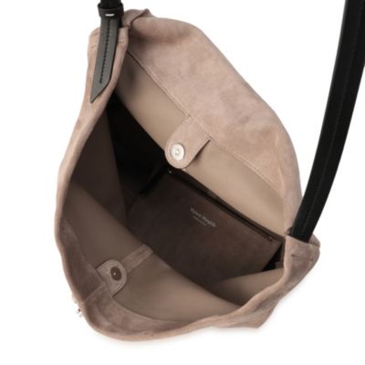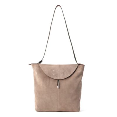 トレンドにカムバックの兆しを見せる、ホーボータイプのショルダーバッグをメゾン マルジェラでも発見。サンドカラーのスエード素材に、収納量たっぷりの縦型デザイン。同素材のポーチつき。(エディターoku)