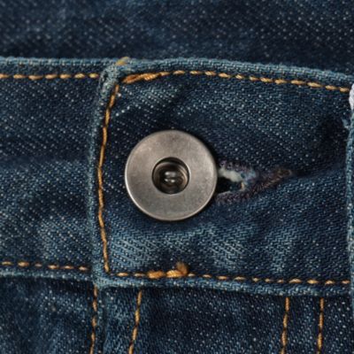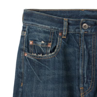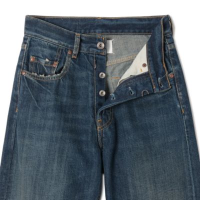 ややゆったりとしたテーパードで使いやすい、今季仕様のハイライズデニム。ヴィンテージ風の色褪せやクラッシュ加工、ボタンフライが今季らしいムードに誘導。バックにあしらったお決まりの4ステッチも、ファンにはたまらないアクセントに。