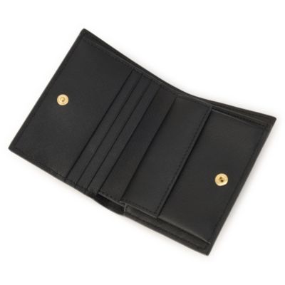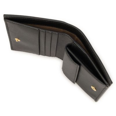 スナップボタンで開閉もしやすい。コンパクトな二つ折りウォレット。サフィアーノレザーの上品な光沢にゴールドの箔押しロゴが大人の風格。折らずに入る紙幣スペース、3つのカードスロットが付いた今を感じる機能派デザインです。