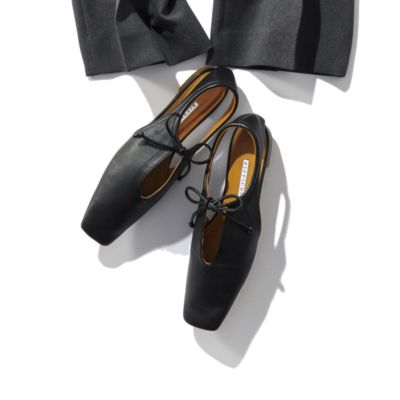 サイドの開きが素肌を覗かせ、レディムードも高まるトゥシューズ。アッパー深めのスクエアトゥで安定感もあり、華奢なリボン結びが女らしい優しい雰囲気に。薄くて柔らかな羊革なので、履くたびに足に馴染んでくれます。