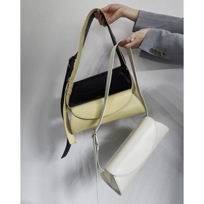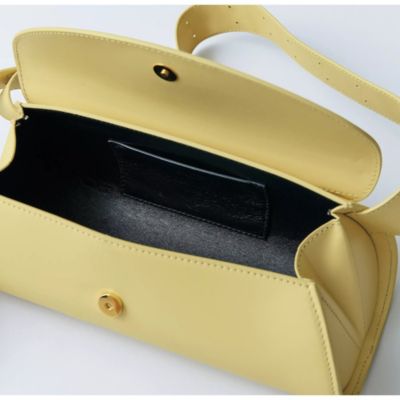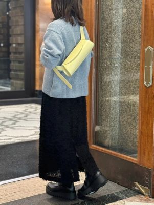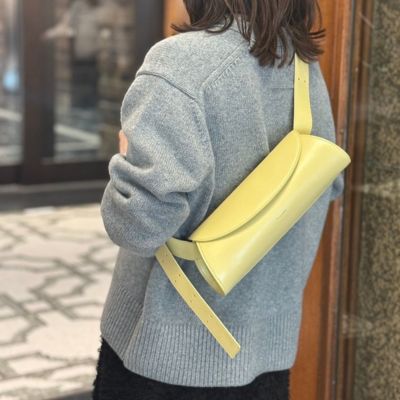 アイコニックな円筒シェイプに、カーフレザーの上品な光沢が印象的。コンパクトな見た目ながら収納力は十分だ。イエローは冬の装いに華やかに映え、リュクスなアクセントに! モダンな筒形シルエットは、マチがあるから物が入れやすい。楕円形のバックルが特徴的なディテールのひとつだ。