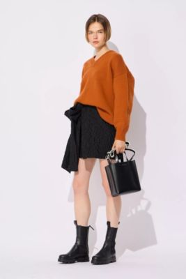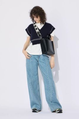 リピートロゴが視線を集めるショッピングバッグ。ストラップは取り外しもでき、ミニマムトートとしても使える2WAY仕様もうれしい。きゅっと絞れる巾着タイプの内袋で中身も見えにくく、異素材の奥行きも洒落感もプラスしてくれます。